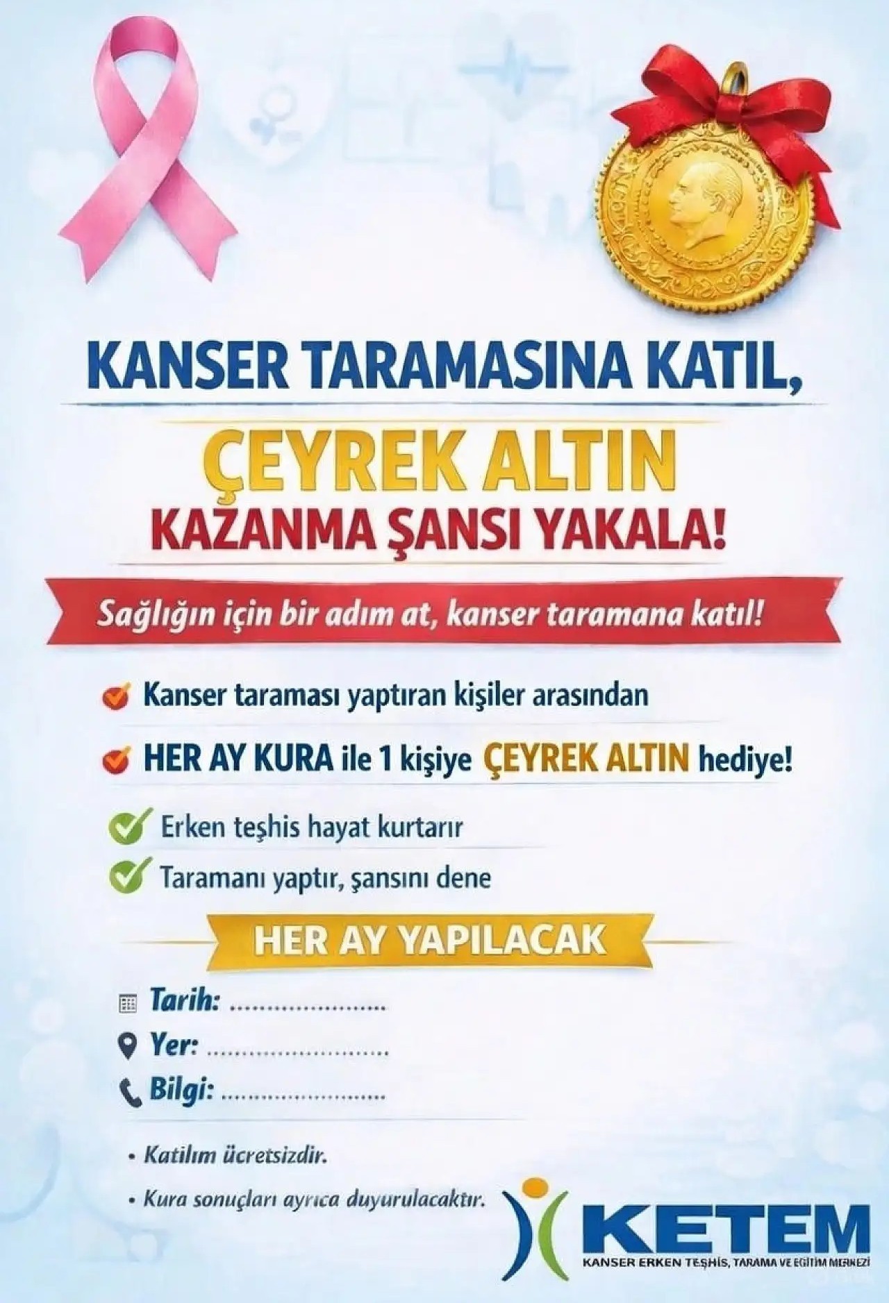 Belirtilen yaş gruplarında yer alarak KETEM’de kanser taramasına katılan vatandaşlar arasından her ay sonunda yapılacak kura çekilişiyle bir kişiye çeyrek altın hediye edilecek. Kampanyaya katılım için herhangi bir ücret ya da ek şart aranmazken, kura sonuçlarının kamuoyuyla ayrıca paylaşılacağı bildirildi.